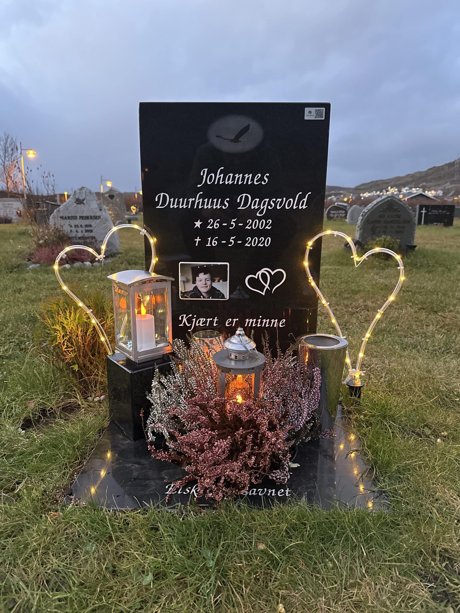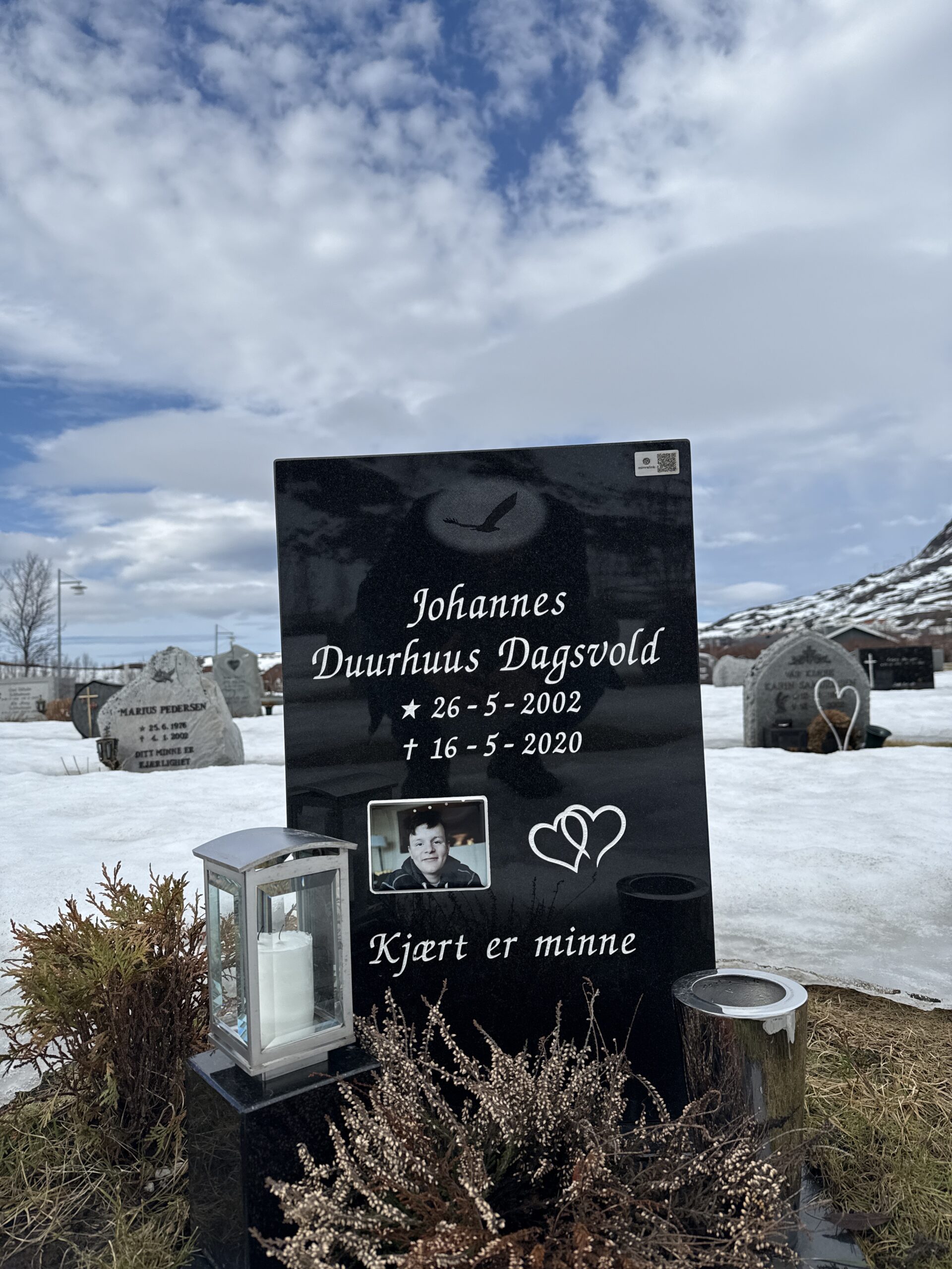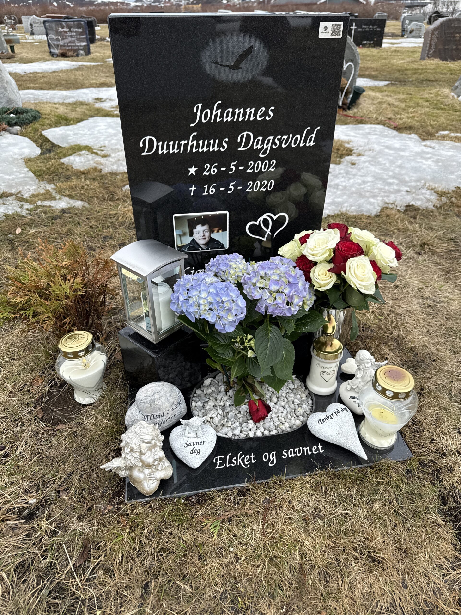 I dag har var vi å besøkte grava di Johannes, savne dæ❤️🕯️ Har satt Qr kode fra Mimrelink på gravstein til dæ i dag så kan dæm som besøke dæ å vil tenne lys, legge igjæn en hilsen å bilde av grava eller valgfritt fra telefon.
