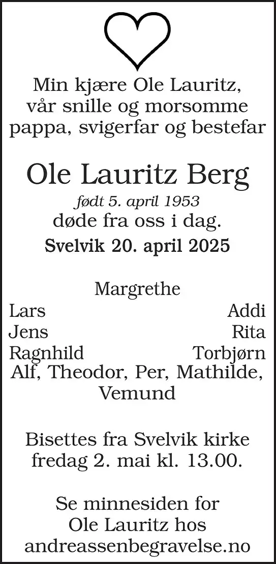 25. apr 2025 på 11:14Kjære Ole Lauritz. Takk for mange gode minner i fra vår barndom og seinere som voksne. Jeg skal aldri glemme deg!❤️