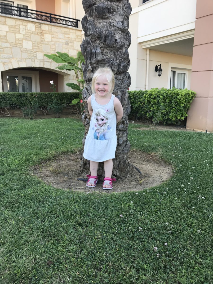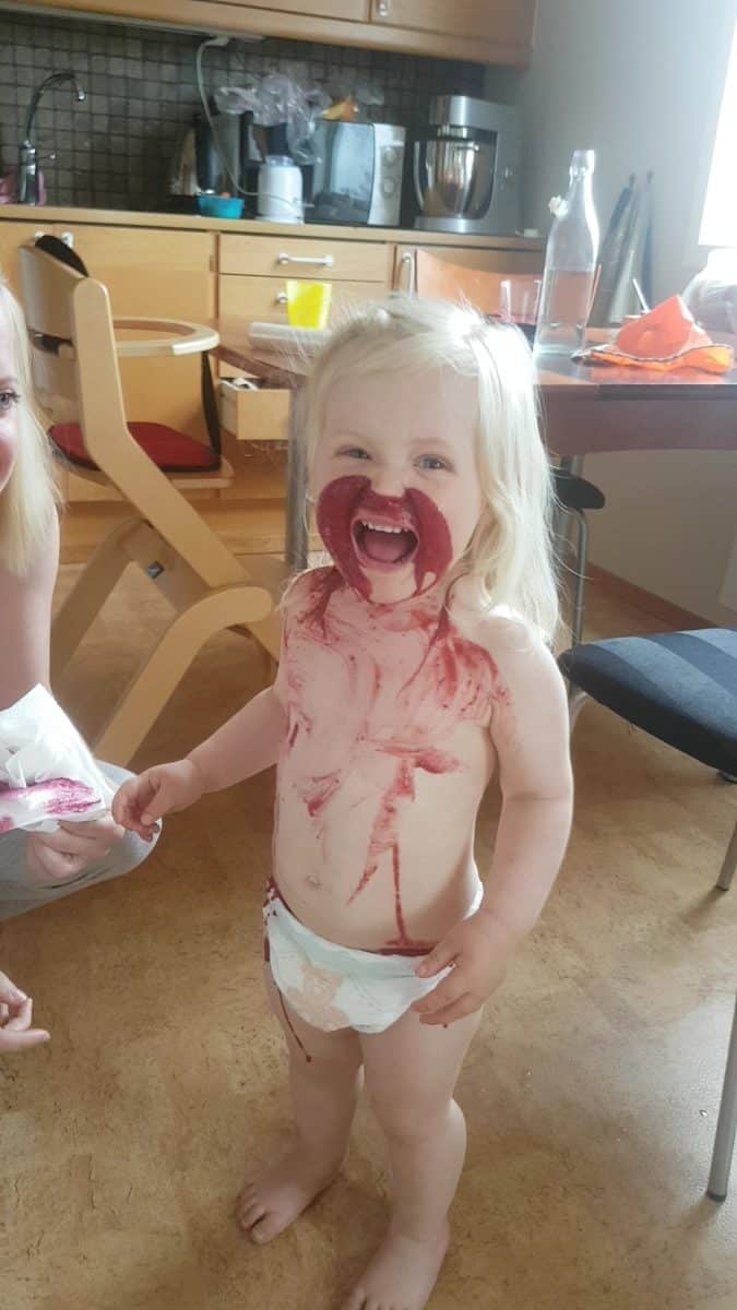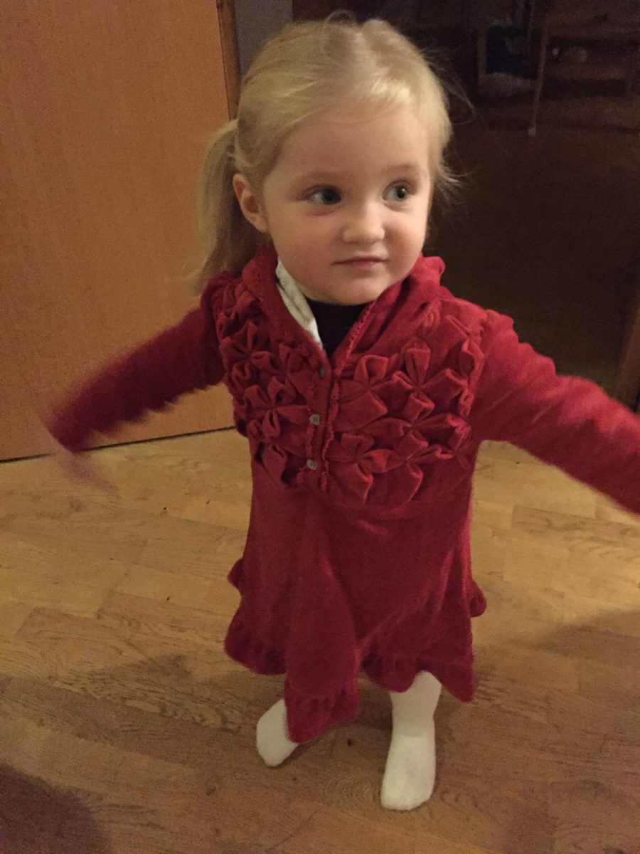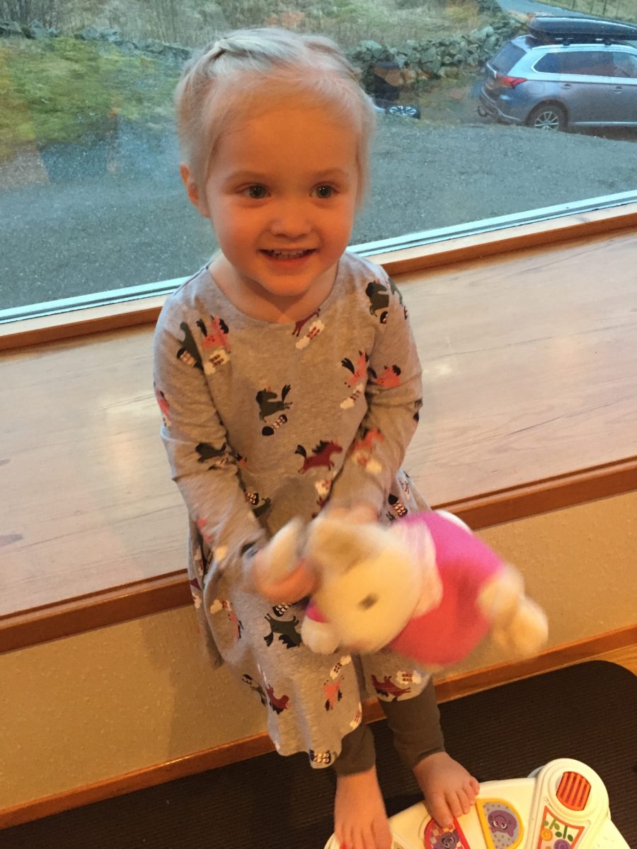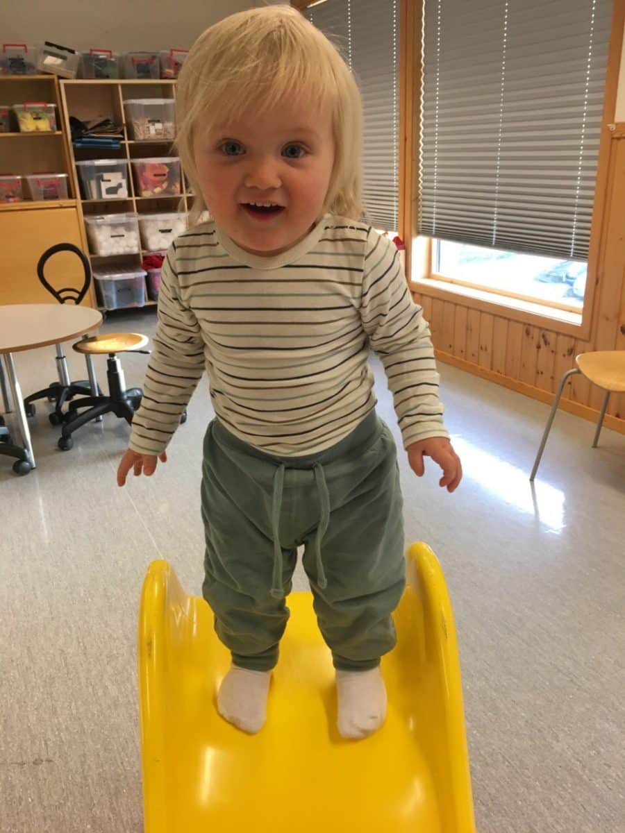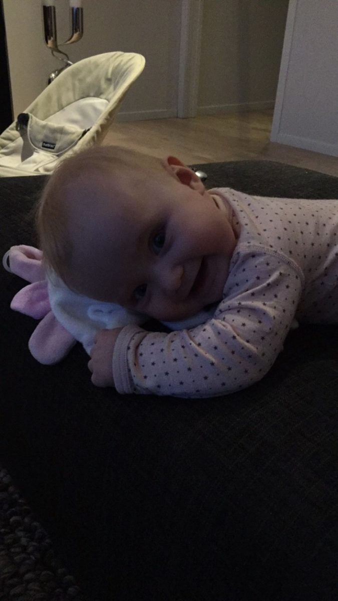 Thea er tidlig både med språk, omsorg og ikke minst; motorisk. Hun reiser seg opp og spiller fotball når hun er 10 og 1/2 måned. Hun snakker rent når hun er to år.